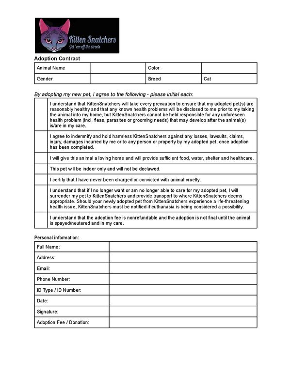 Once signed, you will pay Kitten Snatchers the appropriate fee based on the adoption type. Payment can be made through: